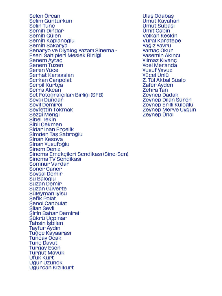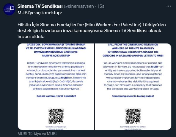 “Bizler, Türkiye’de sinema ve televizyon alanında üretim yapan emekçiler ve sinema paydaşları olarak, kuruluşundan bu yana maddi ve manevi destek sunduğumuz ve bağımsız sinema alanı için varlığını önemli bulduğumuz MUBI’nin, filmlerimiz aracılığıyla elde ettiği görünürlüğü; Gazze’de yaşanan soykırımı ve savaşı finanse eden bir şirketle paylaşmasını kabul etmiyoruz. Sessiz kalmak taraf olmaktır.”