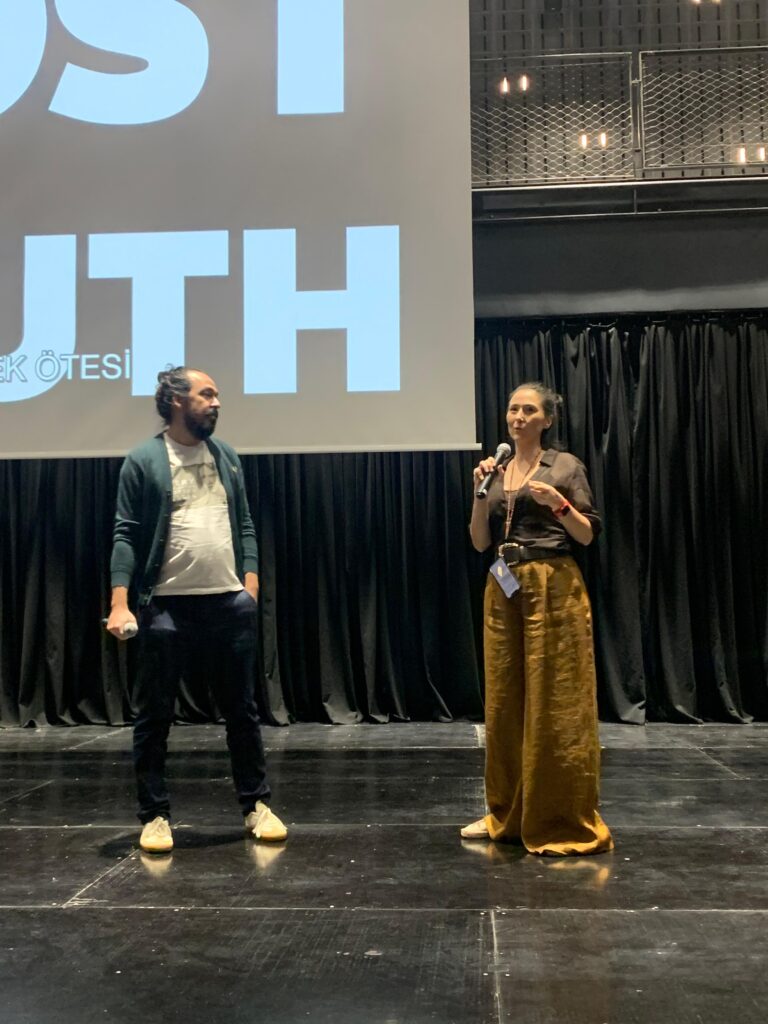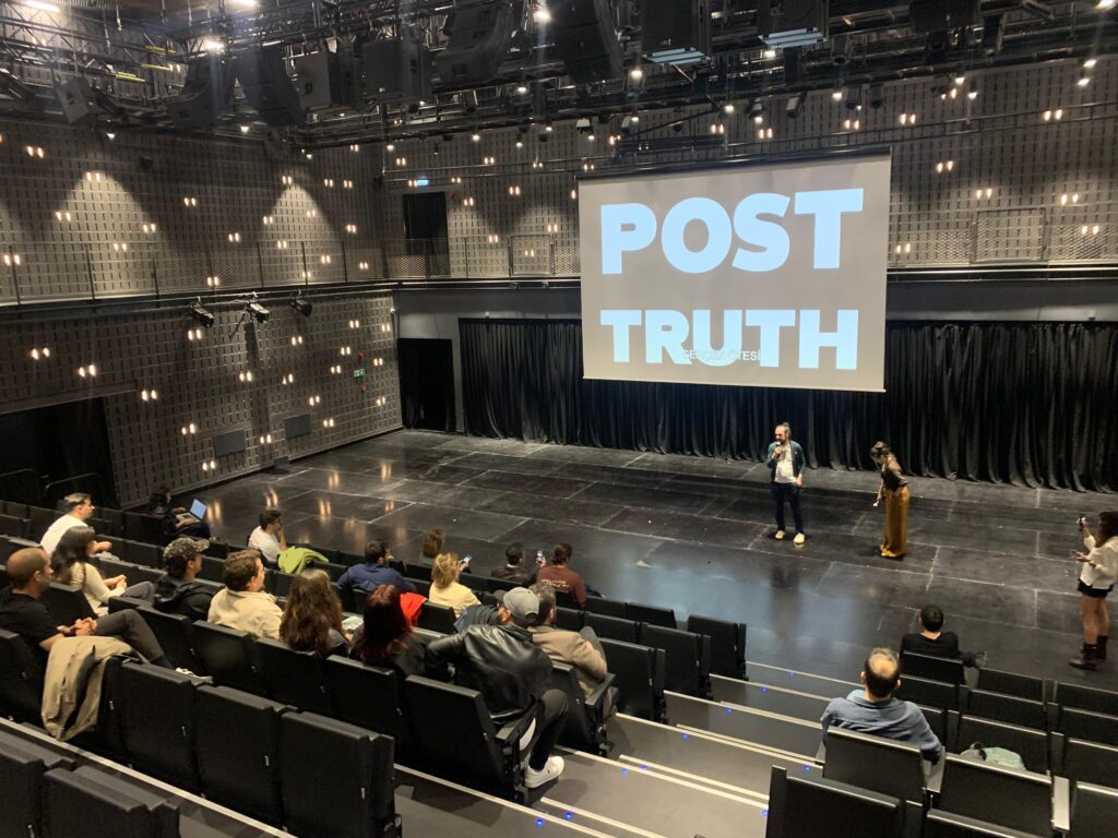 Festivalin ilk gününün kapanışında izleyiciyle buluşan “Post Truth”un gösteriminin ardından yönetmen Alkan Avcıoğlu, moderatör İren Dicle Aytaç eşliğinde film üzerine konuştu. Avcıoğlu, yapımın çıkış noktasını ve yaratım sürecini şu sözlerle paylaştı: Her şeyiyle sahteleşmiş bir çağı sahte görüntülerle belgelemek ve özdüşünümsel bir anlatı kurmak istedim aslında. Filmin içinde tüm görüntüler sentetik ama anlattığı her şey araştırılmış gerçeklere dayalı bilgiler. Post Truth, diğer bir yandan seyircilerin sorgulama refleksini de arttırıyor. Senaryo yazımı yaklaşık iki yıl sürdü. Filmin her sahnesi objektif verilerden oluşuyor; aynı zamanda bir enformasyon bombardımanı olarak kurgulandı. Çünkü dünyamızda da sürekli bir uyaran akışı var ve ben bunu seyirciye aktarmak istedim.